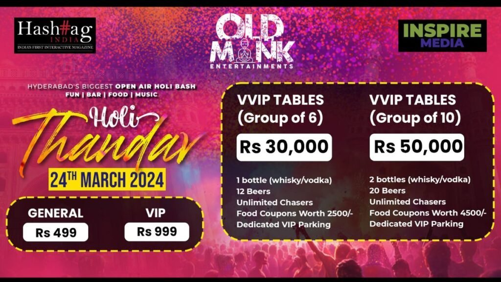 About Holi Thandav: Holi Thandav is Hyderabad’s biggest open air Holi festival, celebrating the arrival of spring with vibrant colours, music, and festivities. Organized by Hashtag India Magazine, Old Monk Entertainment & Inspire Media, the festival aims to create a memorable experience for attendees while promoting environmental sustainability. Join us for a day of celebration and joy at Holi Thandav 2024!